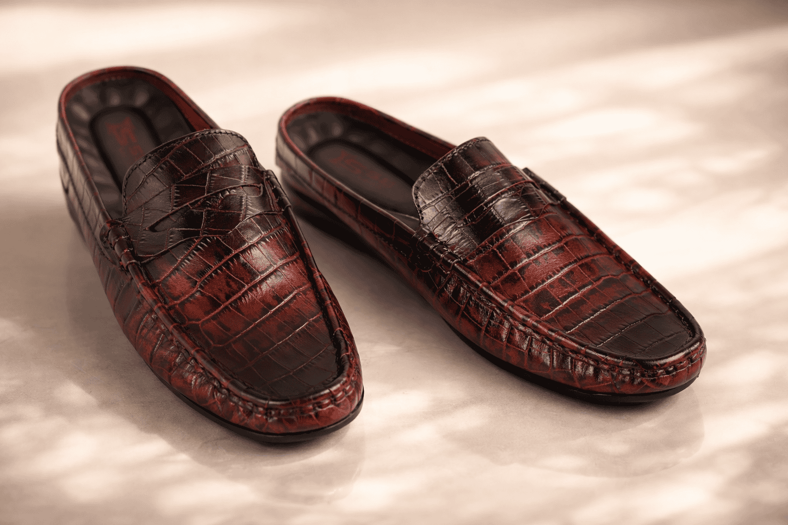 Get the perfect look with these premium crocodile-patterned leather mules. Designed for durability and class, these maroon slip-ons are the ultimate statement piece for the modern man.